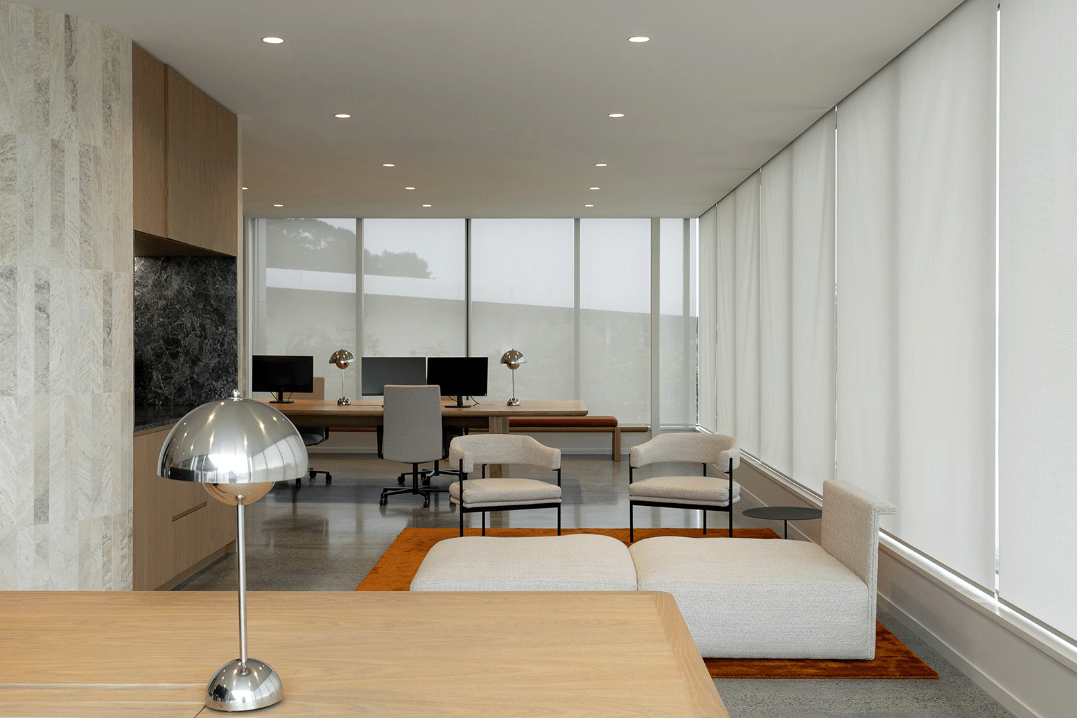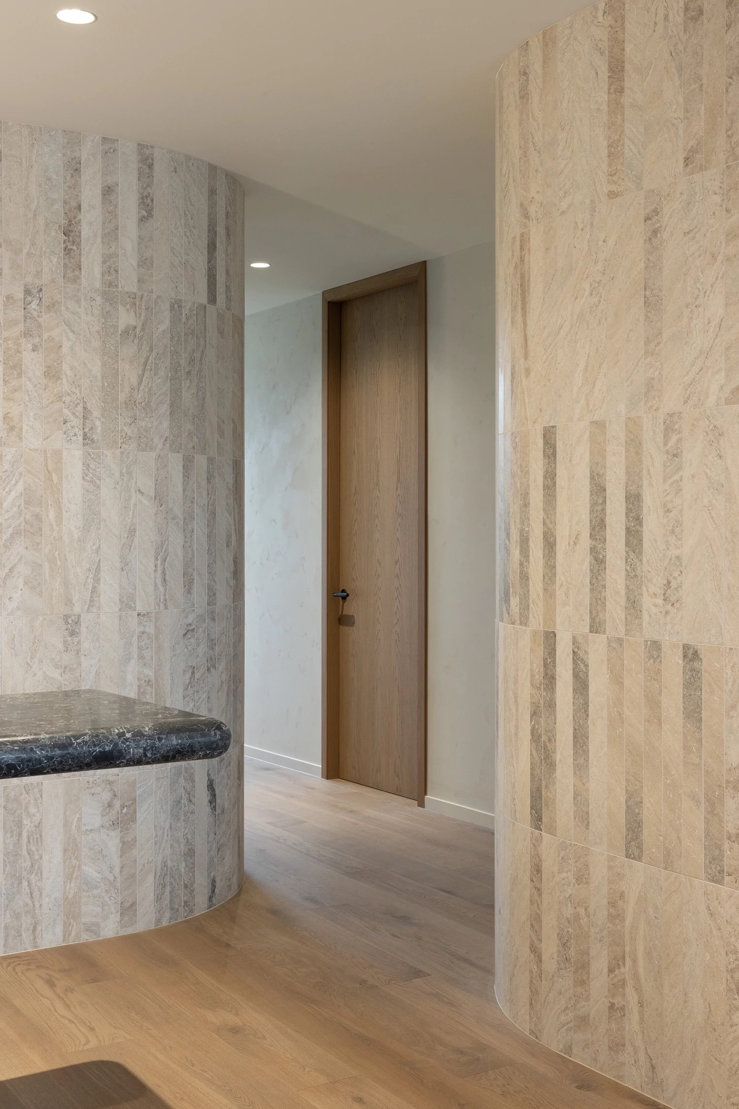 In a quest to create a space that was both calming and inviting while fostering productivity, equal attention was paid to spatial planning, functionality and aesthetics. “We had a soft minimalist approach to the interior architecture. This was articulated through curved walls and clean lines but given warmth and texture through the use of natural materials such as timber, stone, wool and hand-rendered plaster ” says Devon McIntyre, interior designer at Pennant & Triumph.