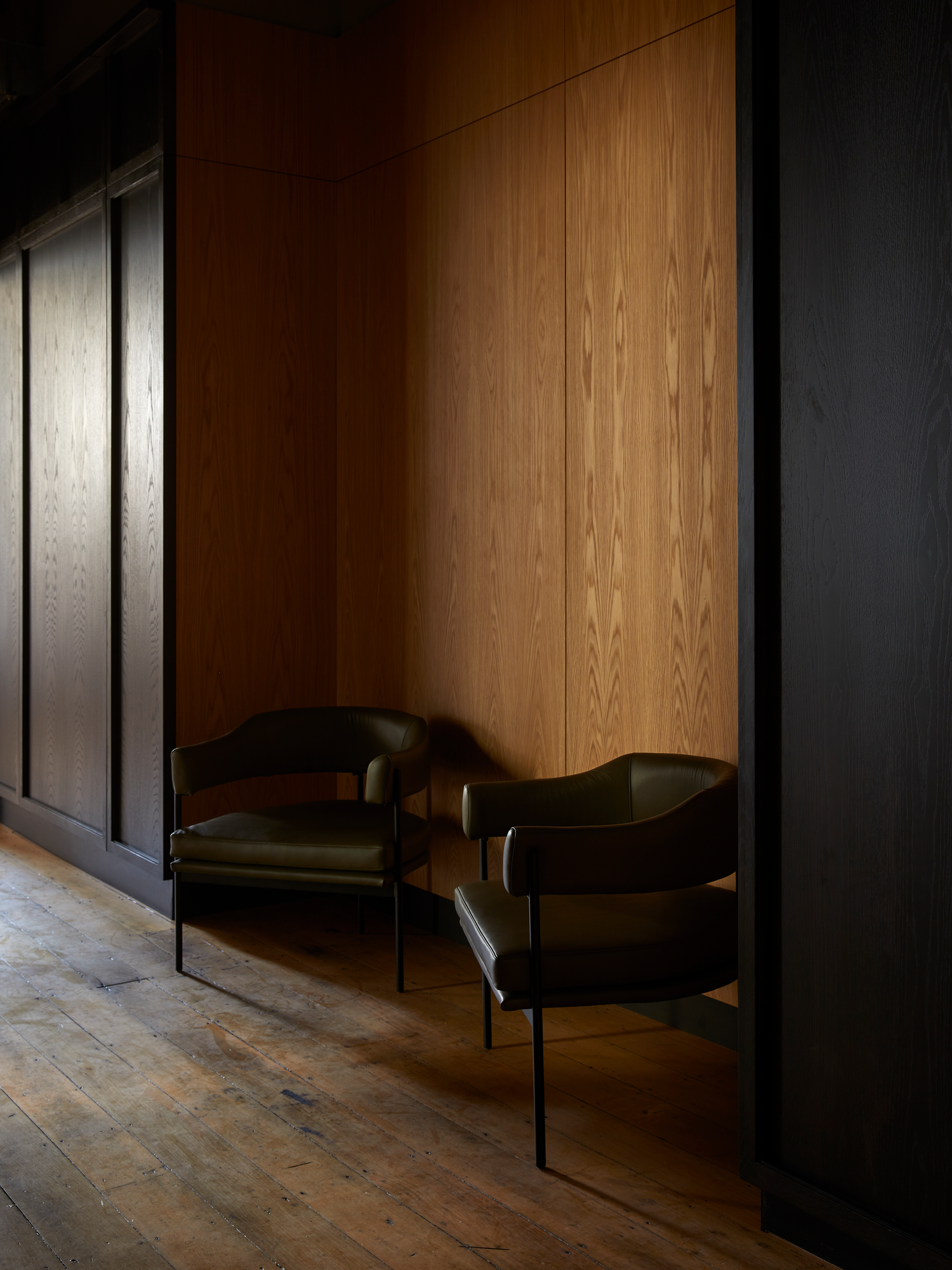 Guests arrive through a dedicated entrance and are immediately wrapped up in a dark, quiet space. Timber wall panelling builds on the cabinetry introduced in pockets throughout the more open spaces and lends a gentler sense of formality to the meeting areas. Lighter, oak-framed linen panels soften the spaces visually and acoustically, and are placed to reflect and enhance daylight in the rooms. Natural light was prioritised in the work, the whole scheme favouring the natural over the synthetic. Bespoke glass screens were introduced to allow that light to reach into the depth of the floorplate. Morning, noon and evening sunshine all lend character to the space as the day passes.