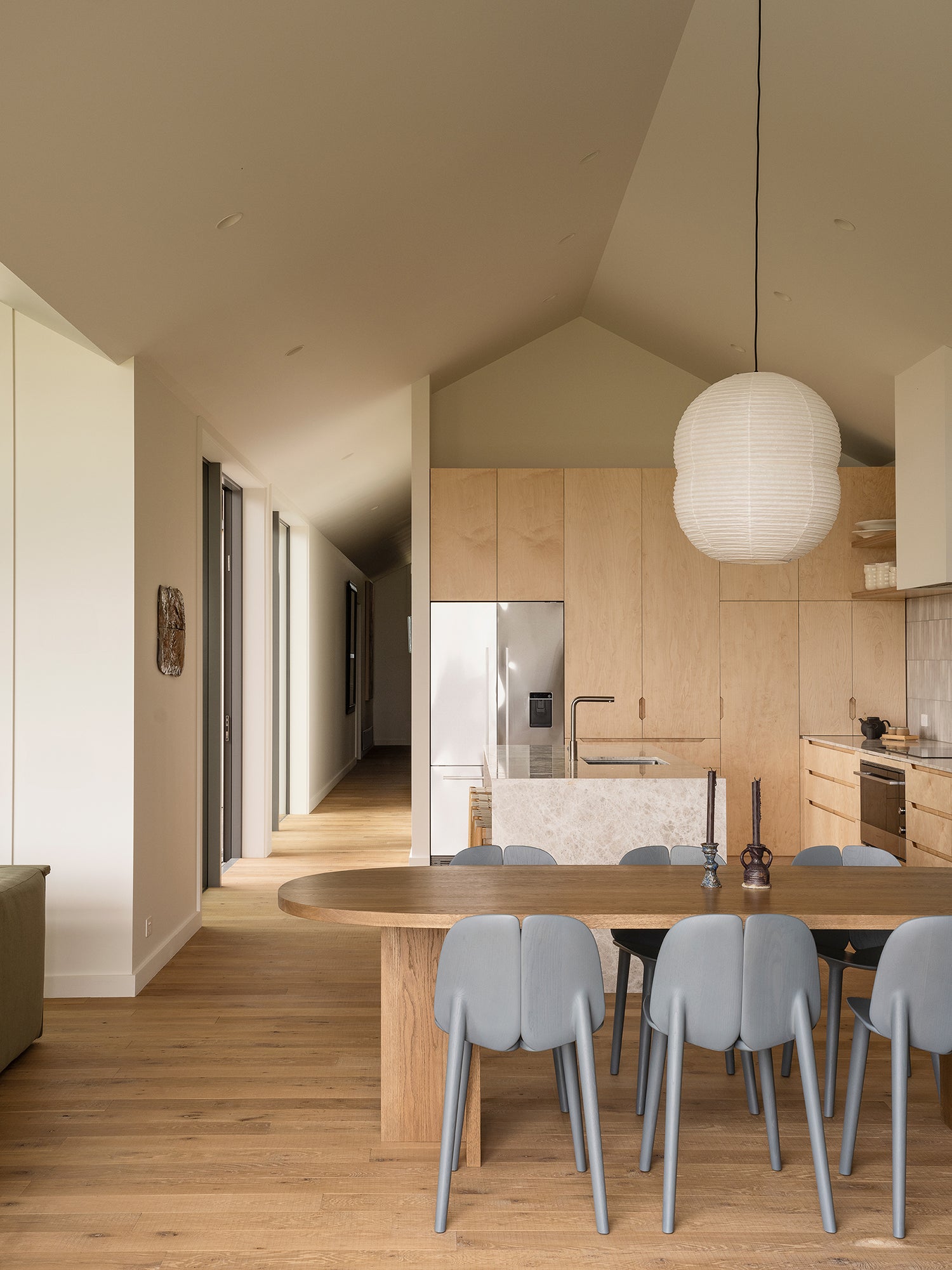 With hardly any fences between the row of houses here, the RTA team needed to find ways of bringing natural light into the central core of the house. This led them to create an internal courtyard accessible from both bedrooms and living - small yet complete with native planting, outdoor dining and a hot tub. Modular and highly flexible, timber screens can also be opened to connect the courtyard to the lake-front social spaces, or closed for more privacy and warmth during the winter months.
