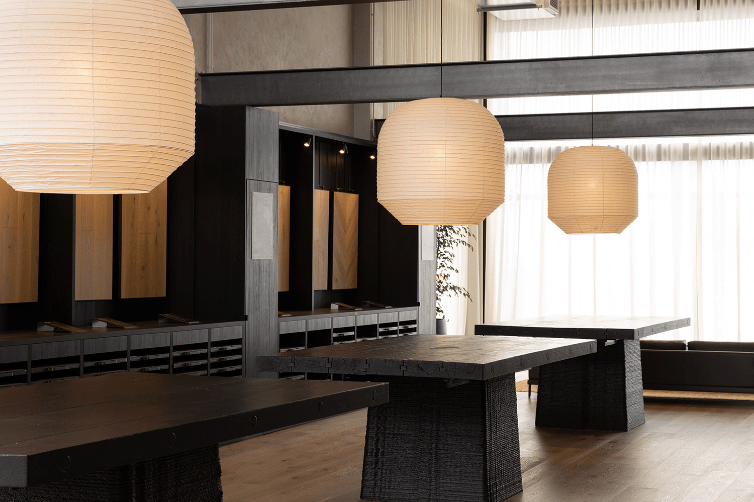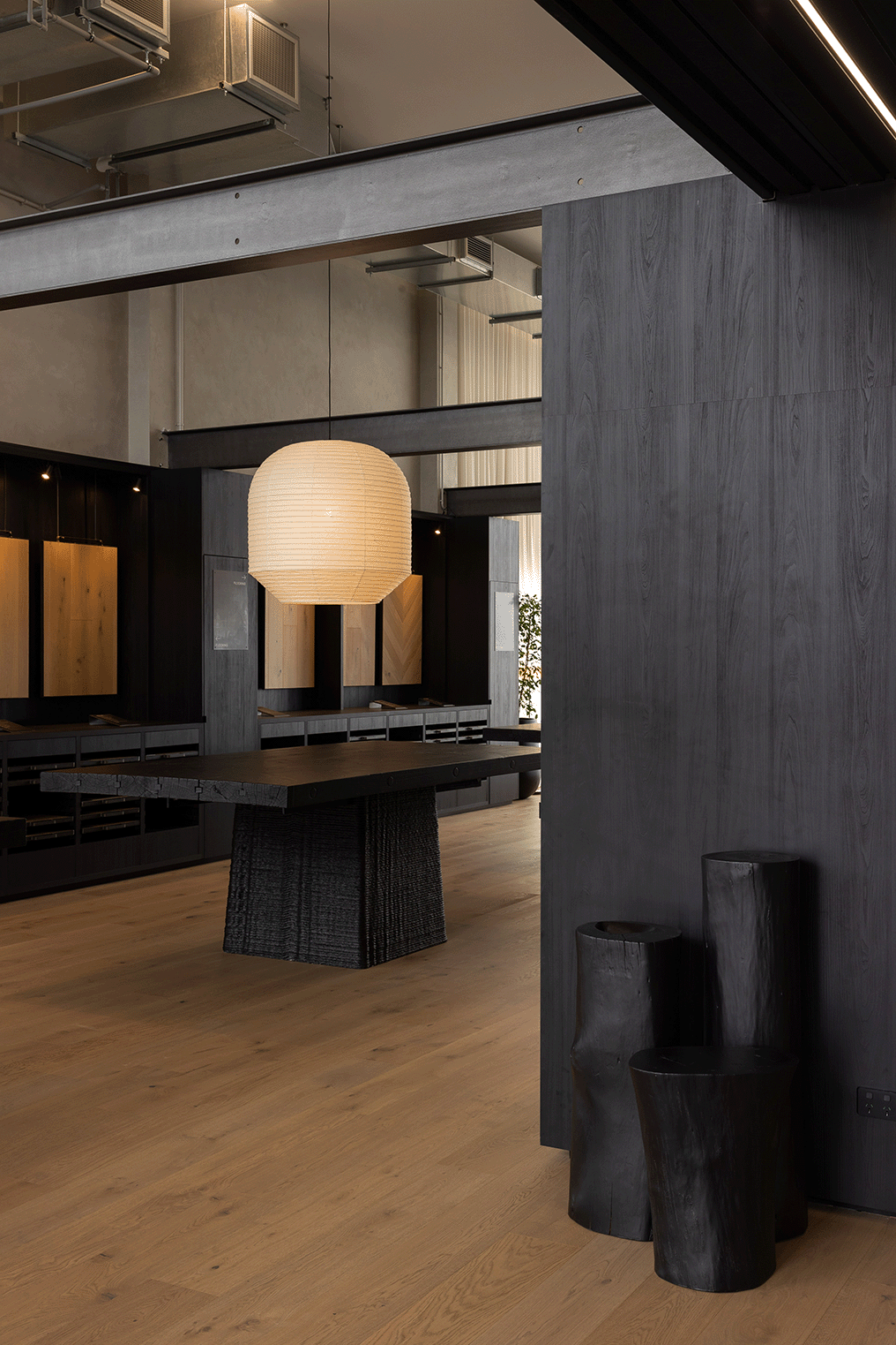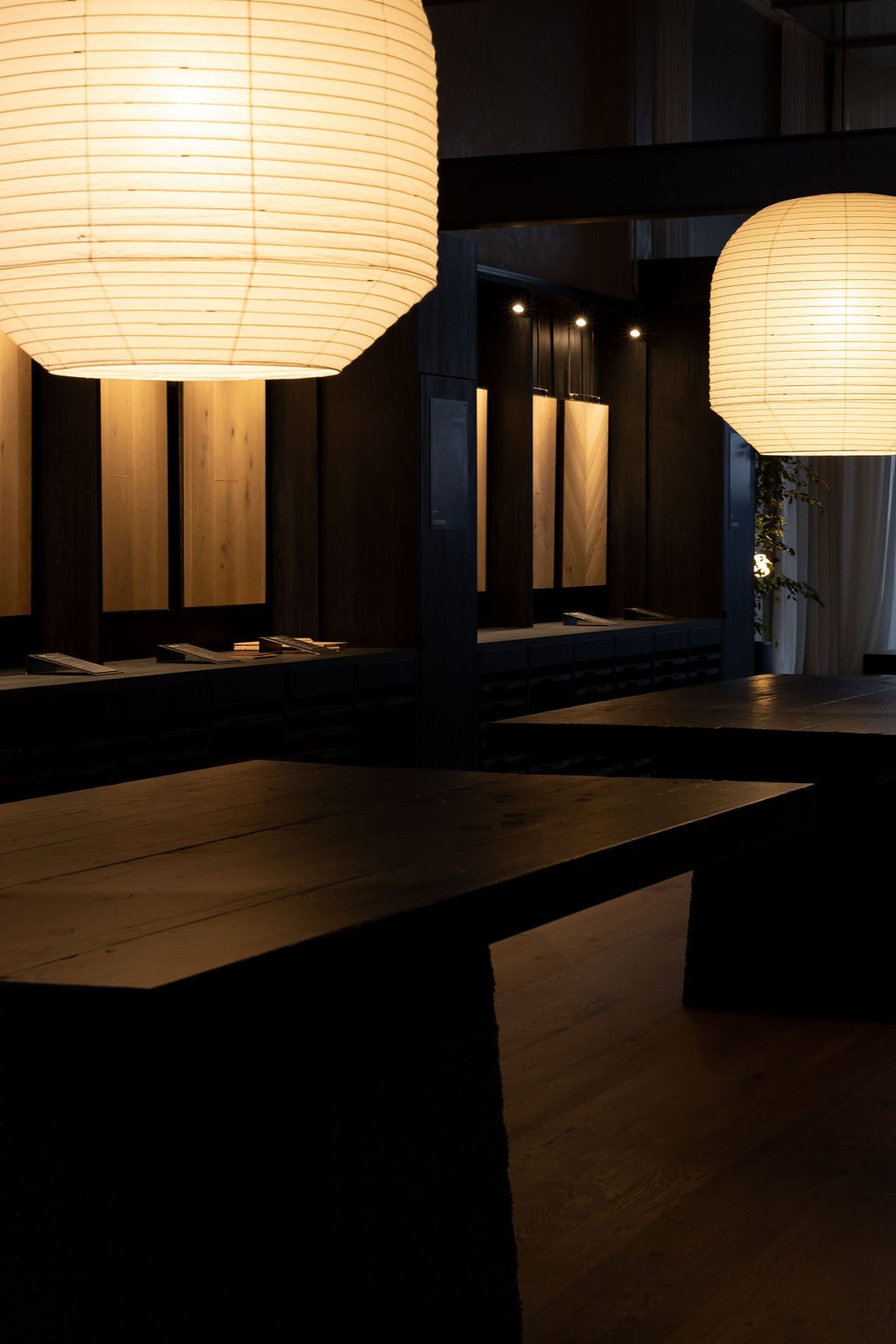 Our oversized Hotaru Buoy pendants suspend above the extruded cement tables with reclaimed Totara tops, creating a playful balance of heavy versus light.