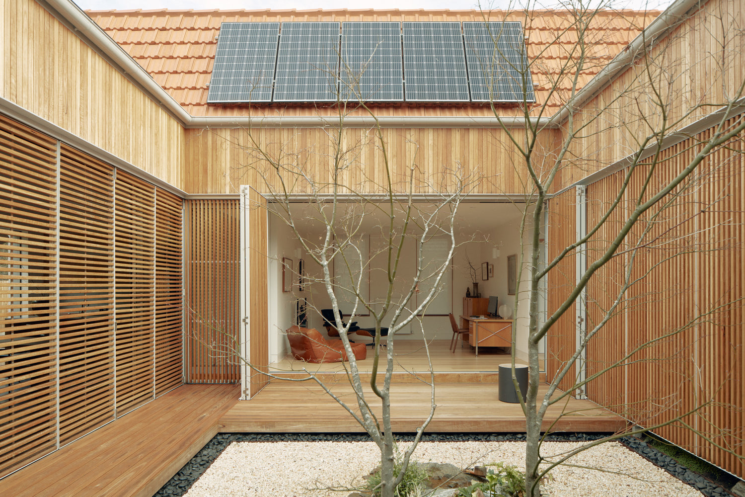 Upon arrival, hidden doorways lead to bedrooms; meanwhile, a lightwell above draws you further along a convoluted path until the central courtyard is revealed. Carved out of the original footprint, the courtyard creates a north-facing living space. Operable timber screens allow the inhabitants to adjust for changing light and climatic conditions — and effect a harmonious juxtaposition of cross-hatched timber with the garden’s organic elements of greenery, water and stone.