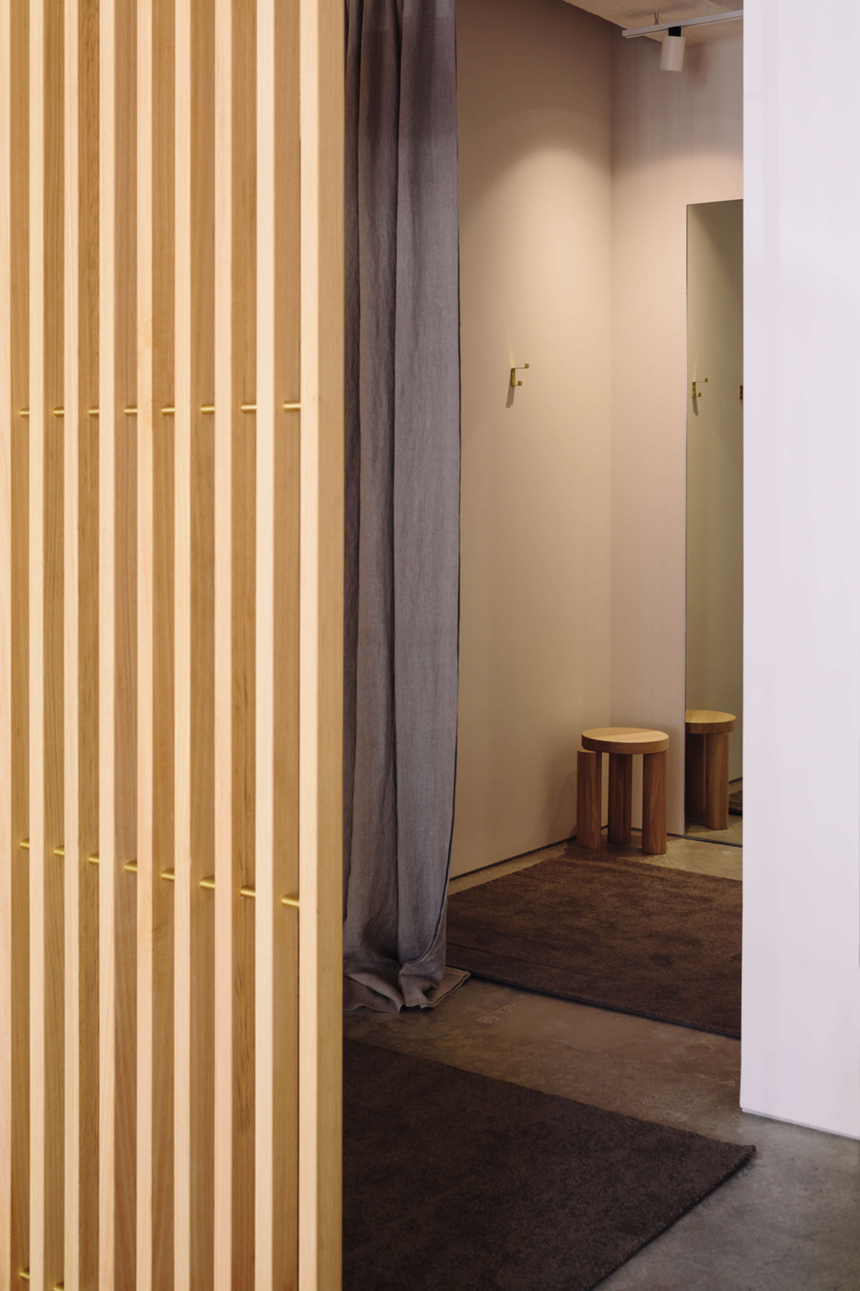 The store articulates minimalism, simplicity and generosity. From the outside, two large windows frame the space. Instead of traditional displays, passerbys have an open and transparent view of the store’s day to day life.
