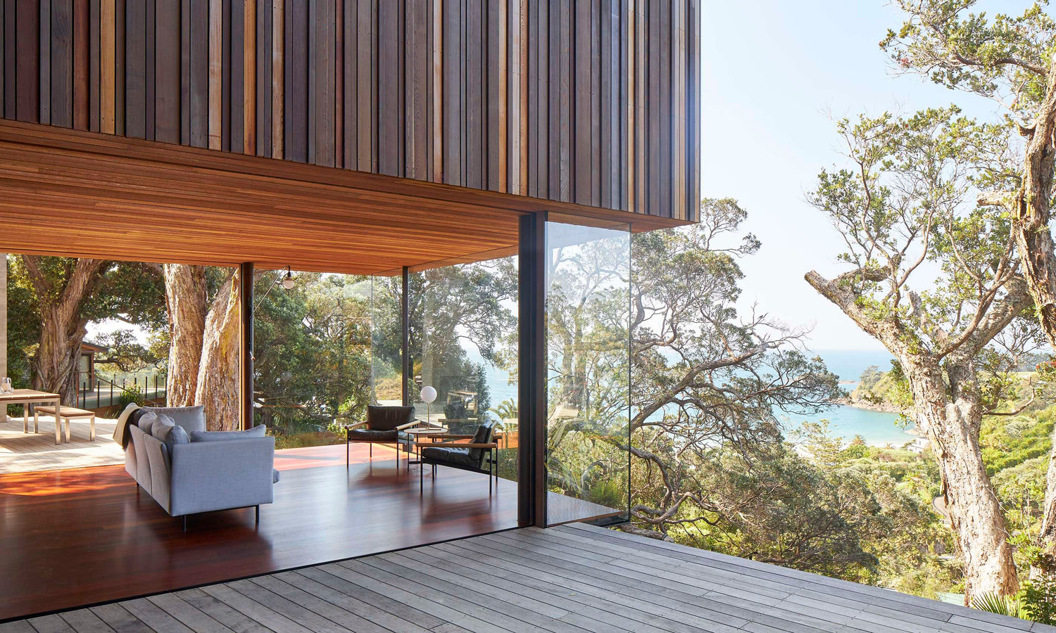 Jo MacKay and Sam Curtis of MacKay Curtis Architecture were approached by the owners of this home with a simple brief: sun and views. They responded with an idea centred around connection to the outdoors and comprising a long deck with a glass box for living, over which hovers a timber box for sleeping.