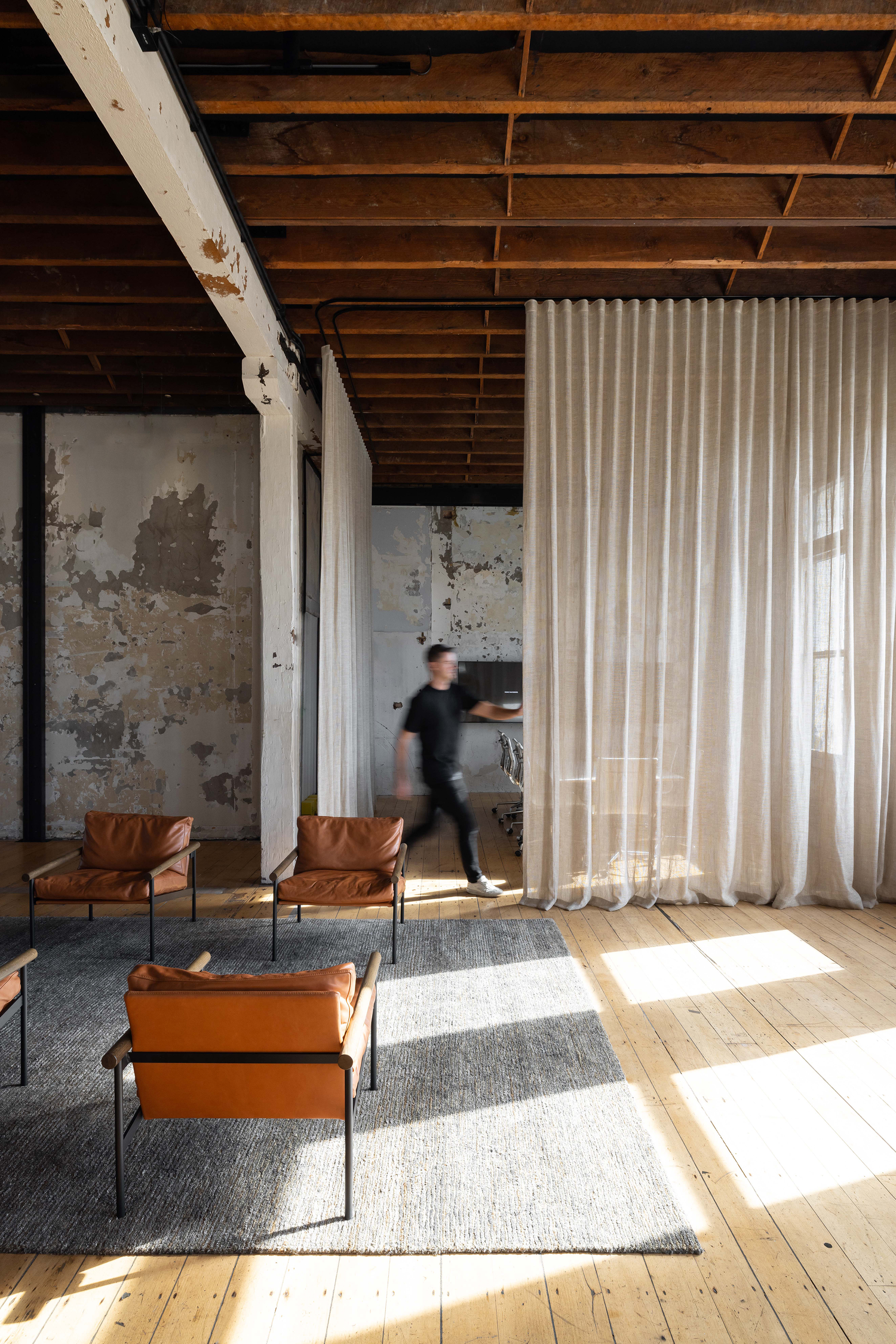 Monk Mackenzie's enduring and considered approach to sustainable design takes in the building's historical heritage as their grounding point. Fully baring patinaed concrete walls and high timber ceiling beams allow for the building space to be occupied as a high-performing open office with minimal disruption. Interior textile elements define each setting within the studio while tactile drapery transform the workspace offering a thoughtful and diverse work environment.