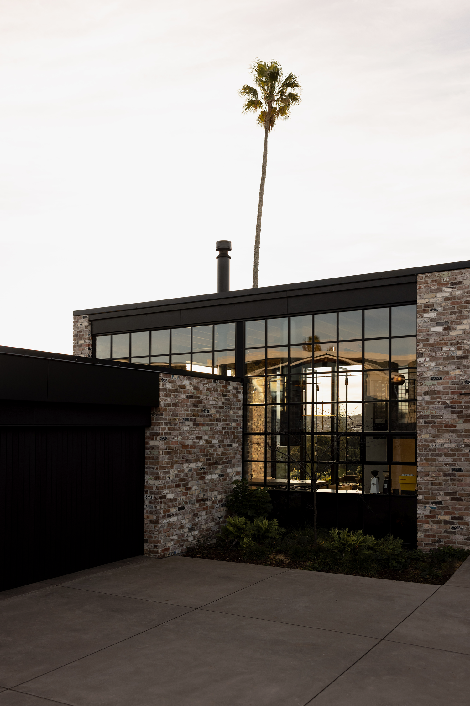 You are greeted upon entrance to a mezzanine opening to double-height ceilings of warehouse proportions, setting the tone visually and spatially. A single wall of exposed recycled brick expanding over the two storeys imposes itself as the mainstay where black metal elements build the rest of the structure. What can only be described as a fleet of colossal glass blades are actually black pivot doors that open the seamless transition from modern industrial living to the luscious views of shoreline evergreens.